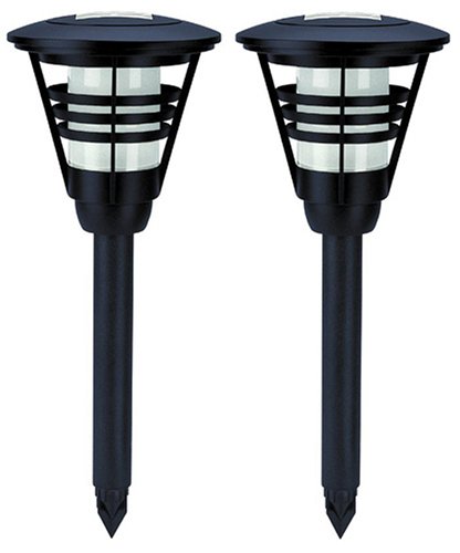 Black finish with frosted lens. Includes ground stake and deck/wall mounting bracket. No wiring is required. Assembles and installs in seconds. At night, the light turns on automatically. Two Light Set.