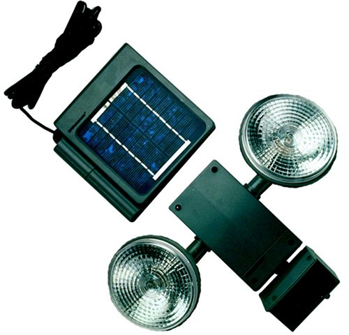 Outdoor solar rechargeable, motion activated flood lights. Solar panel has a 15' cord, shielded motion detector, and adjustable detector range up to 65 feet.