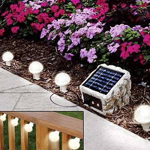 Solar string lights don't require an outlet Line driveway, patio, garden, or walkways with light strands that add a warm, welcoming glow. Includes stakes for ground use or remove and hang from bushes, patio umbrella - you name it! Solar panel with fourteen string lights on 50' strand.