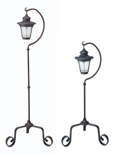Pre-assembled solar rechargeable garden light includes adjustable height hanging hook, ground stand, and adjustable free-standing patio stand. Remove fixture from hook to use as a table lantern. Weathered patina finish with bubble glass lens.