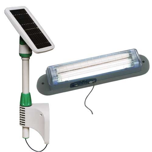 Super efficient monocrystal solar panel, light fixture holds two 8 watt fluorescent lamps, with a rechargeable lead-acid battery, 6 volt/2.5 amp., 25" high. It burns up to 4 hours with full charge (one day of sun). No outside electrical wiring needed. Sec ure the solar panel on the side of the building, and the light inside and let the sun do the rest. Can be easily installed on all types of material; metal, wood or plastic. Compass included for easy solar panel adjustment, built in night-light inside to f ind the switch easily.